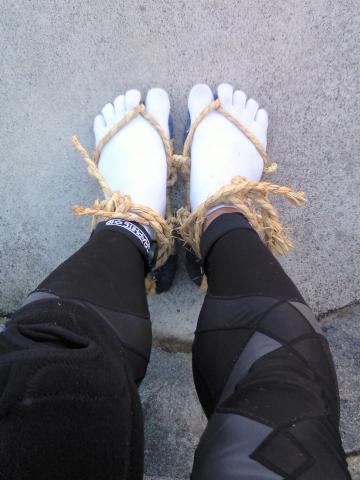 ②ルナサンダルは英語が出来ず?買えないけれど、金曜日に駅前アルプスで日本版ワラッチ=わらじを購入し、本日試す。履き方はネットで探した中からシンプルなものを選択し、見本と購入したわらじの形状が違うので少しアレンジして装着。様子を見ながら3KM試走。