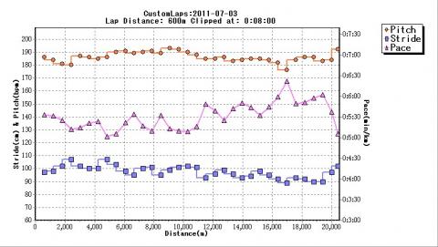 脚が動かなくなり、典型的なダメレースのパターンで終了。グラフを見ると、3周目からピッチがだんだん遅くなっていた。給水も積極的に摂ったつもりが、全く足りていなかった。同じ路面を走っていても、時間が経つと足裏がだんだん痛くなって来るのが課題。なかなか裸足ラン25kmが達成できない(^^;)