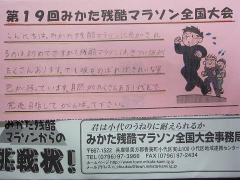 みかた残酷マラソンからの「挑戦状」が来た。中を開けると、小代小学校6年生、音色さん(「ねいろ」って読むんやろか?女の子?)からの手書きのメッセージ!!封筒には、「挑戦状」って書いてあるし、手書きメッセージはあるし、これはがんばるしかないやんね~。心憎い演出やな~。 (^-^;(今年、初めての出場です)