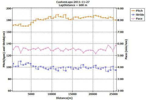 太腿裏に軽い痛みがあるものの、4周目も無事終了。さてここからが今日の主眼、いわゆるレースペースで後2周を余裕を持って走りきろうと5周目突入。ペースもほぼ目標通りだったが、半分くらい過ぎたところから足が重くなり、5:40/km台がやっとくらいまでになった。距離が25kmに達した時点で終了しようかと思ったが、その後ややペースが回復。5周終了の段階で30kmまでは残り4km程だったが無理をして大きなダメージを残さないように5周で終了した。