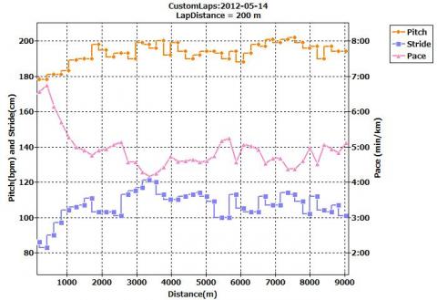 12日と比べると、ピッチが速めだった。ピッチが速いから痛くないのか、痛くないからピッチが速く出来るのか??12日以降急に足裏が丈夫になったとは考えにくい。路面温度が高めで、足裏への刺激が丁度よく、速めのピッチが維持出来たと言うことであろう。