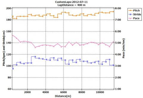 ヴァーチャルレーサーには府道に出るあたりで追いついた。地図の縮尺は80mのままで固定。折り返し、前回シャットダウンした8.9km地点が近づくと、ちょと緊張した。8.9km地点は部無事通過、府道沿いに入ってラストスパート。