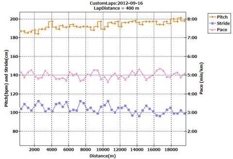 残り半周くらいになってから頑張って少しだけペースアップ。ピッチも落ちている感じだったが、ピッチを表示させてみると200/分近かったので意外だった。このまま4周完了かと期待していたところ、「みのり橋南」で3回目のLow Battery、画面をタップしても表示がなかなか消えないのでヤバそう思った瞬間、画面が消えた。やはり1回目のLow Battery表示からは、10km近く走れる様だ。